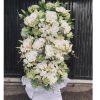 kệ hoa buồn hoa viếng kệ hoa thiết kế tone trắng làm chủ đạo gồm hồng trắng , lan hồ điệp trắng , lan thái trắng.và lá cau