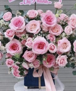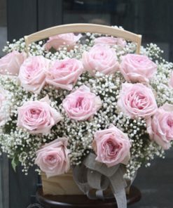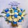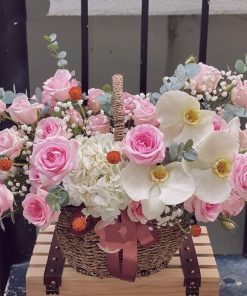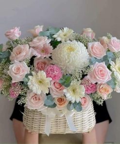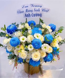 Giỏ hoa sinh nhật tone trắng đỏ , hồng đỏ ,hoa cẩm trướng trắng