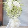 VÒNG HOA CHIA BUỒN TONE TRẮNG , XANHKẾT HOA HỒNG TRẮNG, HOA MÔN XANH, HOA SÓI TRẮNGTRANG TRÍ NƠ LỤA TRẮNG, KỆ GỖ