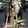 VÒNG HOA CHIA BUỒN TRÒNKẾT HOA HỒNG TÍM, HOA HỒNG TRẮNG, CÚC BINGBONG TRẮNGTRANG TRÍ NƠ LƯỚI TÍM, KỆ GỖ