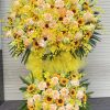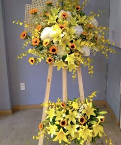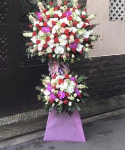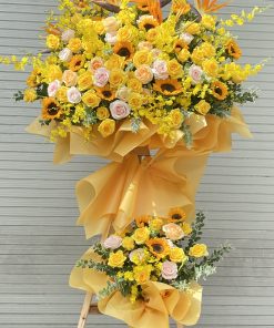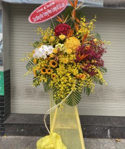 kệ hoa khai trương chúc mừng tone đỏ vàng . hồng đỏ hồng vàng thiên điểu .