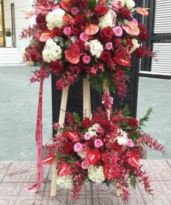 kệ hoa khai trương chúc mừng tone đỏ vàng . hồng đỏ hồng vàng thiên điểu .