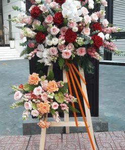 kệ hoa khai trương chúc mừng tone đỏ vàng . hồng đỏ hồng vàng thiên điểu .