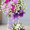 VÒNG HOA CHIA BUỒN,HOA MÔN TRẮNG, HOA HỒNG KEM VÀ TRẮNGTRANG TRÍ NƠ TRẮNG KỆ GỖ